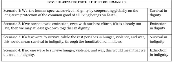 The following question arises: In the face of this grave situation, what kinds of futures are in store for humanity? After nearly fifty years of research and practice on all continents, Lindner suggests that there are four possible scenarios, as shown in Table 1.